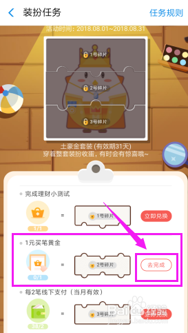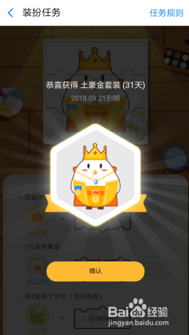 把三个“当即兑换”都兑换了,我们就可以获得我们想要的土豪金套装。套装可以利用31天,31天后我们可以从头做使命再次获得套装。