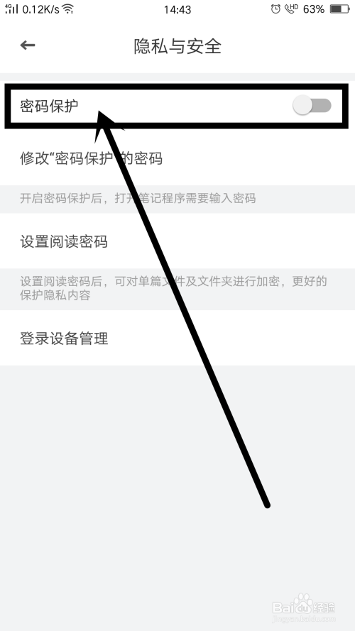 接着,在隐私与平安里,开启密码庇护开关,如图所示