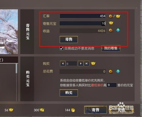 另一种采办铜钱的方式是在官方商城中利用元宝寄售的体例采办铜钱,打开商城后点击右下角的寄售。