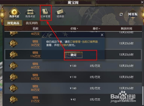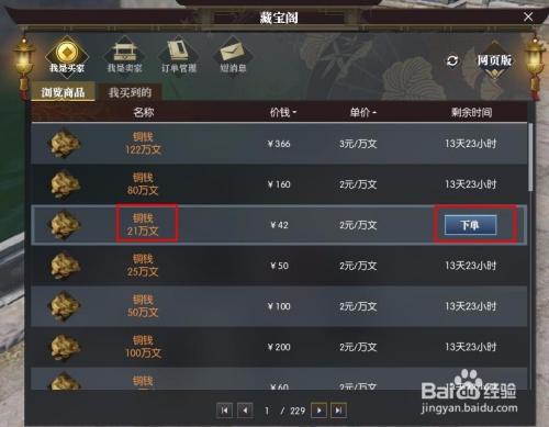 然后点击苍宝哥打开藏宝阁,在藏宝阁我是买家页面我们鼠标移动到需要采办的铜钱订单上,就可以在右侧显示下单按钮,点击合适价钱的铜钱后面的下单。