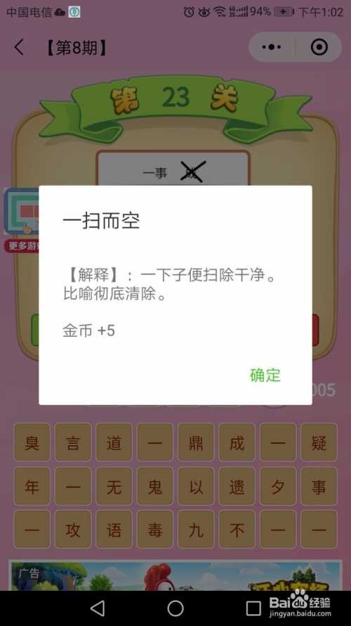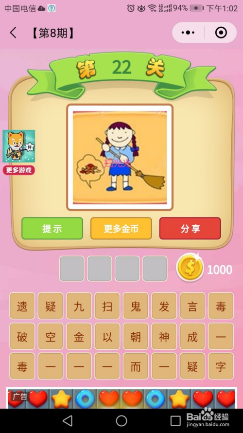 来看第22关,画面中一个可爱的小姑凉拿着一把年夜扫帚,并配有文字“扫光光”。