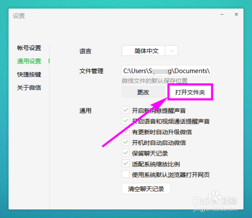 进入通用设置界面今后,在页面右侧的区域图示位置单击【打开文件夹】。