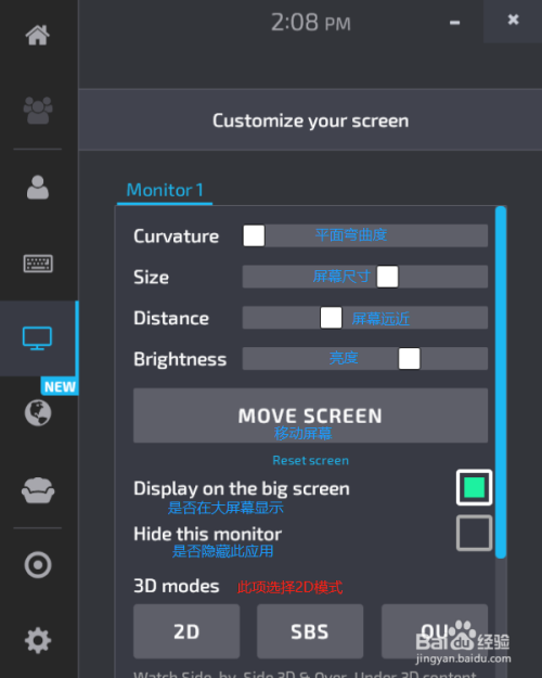 投屏应用拥有浩繁可调节选项,以下简单介绍几项主要的功能,图为VR投屏时的屏幕调整选项,用户可按照习惯,调整投屏时的各项参数。