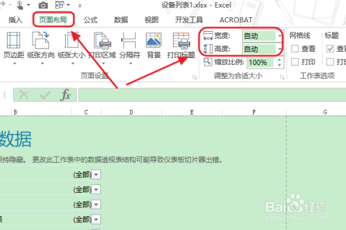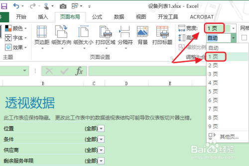 ②此时我们返回到表格,然后点击东西栏的“页面结构”,下方有一个宽度和高度,一般来说这两项是主动的,我们手动全数将其设置为1页即可,如许我们会发现适才的页面会打印到一张纸了;