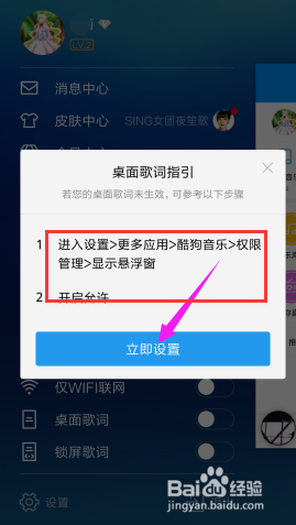页面呈现提醒,这暗示没有开启权限。我们想要显示桌面歌词就要先去设置开启权限。点击【当即设置】。