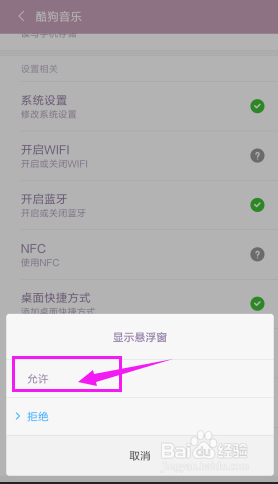 像上面的桌面歌词无法显示,所以要点击【显示悬浮窗】,把权限点窜当作【许可】。
