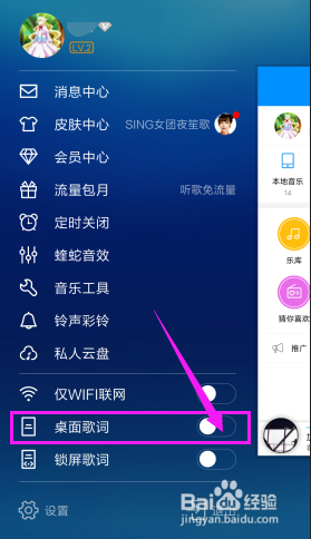 然后返回设置页面,把桌面歌词开启,开启后,桌面就会显示歌词了。锁屏歌词也是一样的。因为此刻蓝牙功能是开启的,所以我们的歌词设置只要和泛泛一样就可以了~