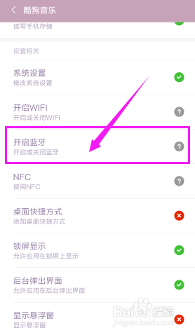 在设置这里,我们可以查抄下其他权限。好比我们是要知道我们的蓝牙为什么不克不及显示歌词,所以先找到【开启蓝牙】并点击。若是这里是个红色的×就暗示蓝牙没开启,只要开启了歌词就能显示了~