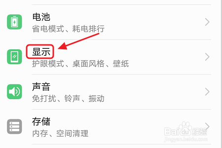 我们首先打开手机,然后点击桌面上的“设置”图标,然后在设置选项列表中找到“显示”,如下图;