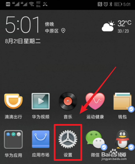 打开本身的华为p20手机进入手机的系统内,找到手机的设置图标,点击进入设置。