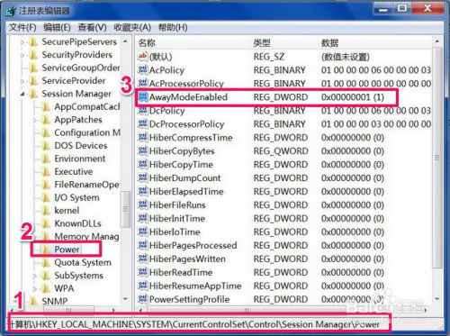 然后依次打开【HKEY_LOCAL_MACHINE → SYSTEM → CurrentControlSet → Control → Session Manager → Power】,在Power右侧窗口找到 AwayModeEnabled 项。