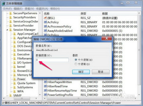 双击AwayModeEnabled,在打开的点窜框中,将数据数值改为0,确定。退出注册表,点窜完当作。有的可能要重启电脑才能生效。