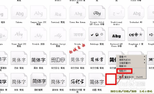 点击空白处,右键选择粘贴。万万不要点中其他字体文件。