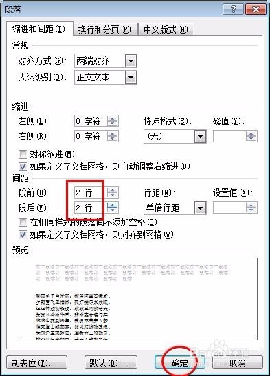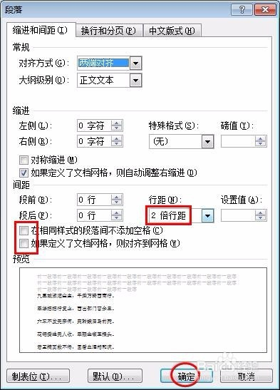 第三步:行距设置为两倍,红色线框标识表记标帜的位置去失落勾选,单击“确定”按钮。