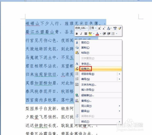 第一步:选中要调整行间距的文字,单击鼠标右键,选择“段落”选项。