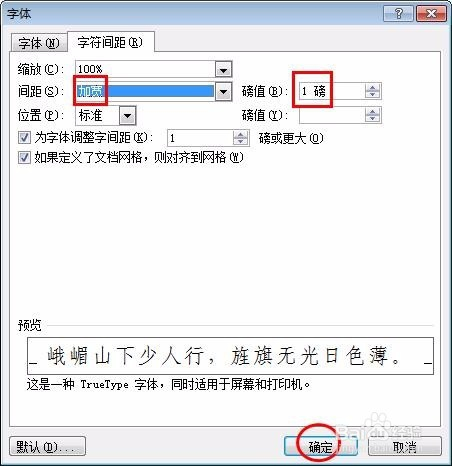 第四步:将字符设置为加宽,磅值为1磅,单击“确定”按钮。(缩小字间距的方式是一样的,这里不做过多介绍)