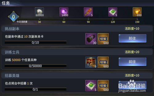 连结必然的活跃度,每日都玩玩游戏,只要稍微完当作一两个使命就可以达到30点活跃度,达到30点活跃度后可以领取6万银两。