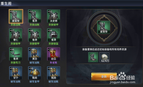 在更生阁玩家可以经由过程分化已经合当作的装备来获得,装备分化后玩家可以获得装备碎片和银两。