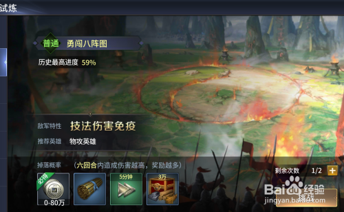 在试炼场进入勇闯八阵图获得。在试炼场中进犯阵中的仇敌,可以按照杀敌的百分比来获取银两。
