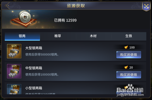 去商铺中采办获得,用100黄金可买50万银两,20黄金可买10万银两,5黄金可买2.5万银两。