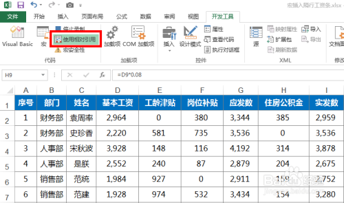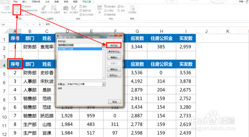 点击"开辟东西"下的"宏",找到录制好的宏,然后点击"执行",即可完当作下一个隔行且带表头的工资条的建造。