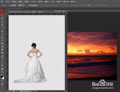第四步:在左侧东西栏中选择“移动东西”,将人物图像移动到落日布景图片中。