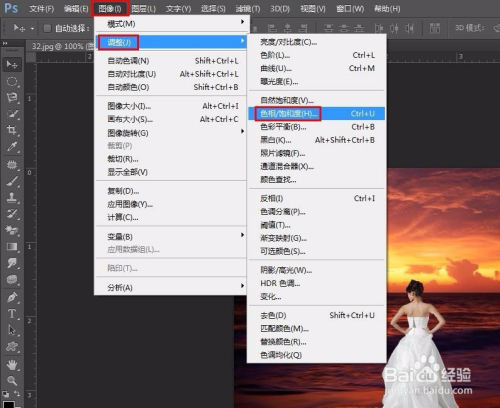 第六步:在菜单栏中选择“图像--调整--色相/饱和度”选项。