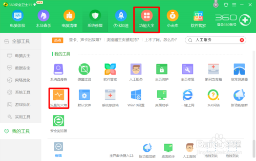 首先,我们打开360安全卫士(我用的是360,其他的一些电脑平安软件应该也有相似的功能),在“功能年夜全”里找到东西“流量防火墙”。