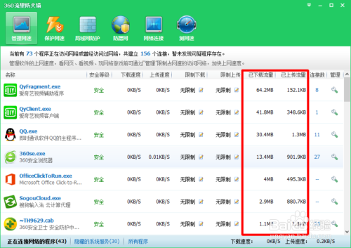 打开“流量防火墙”后,我们就可以看到所有正在连接网络的软件流量利用环境。