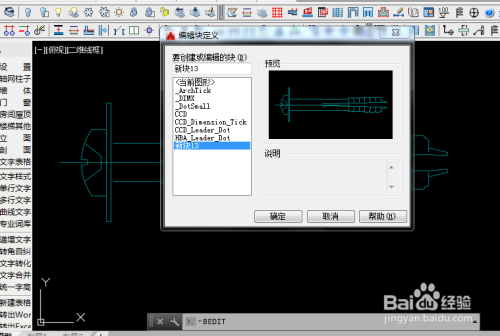 在号令行中输入Bedit后再空格键,CAD就会弹出一个“编纂块界说”的对话框,选中要点窜的螺栓,按确定。