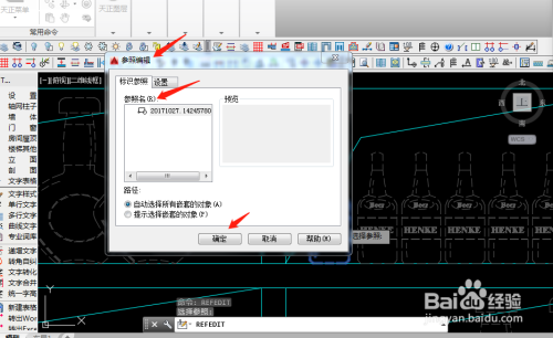 我们用矩形光标选中要点窜的酒瓶块,系统会弹出块参照编纂对话框(这里需要注重一个问题,若是要点窜的块没有含别的的块,参照名中只会显示一个块名,那直接按确定就行了,若是要点窜块还含有其它的块,那我们要在参照名中选择真正要点窜的块,再按确定)