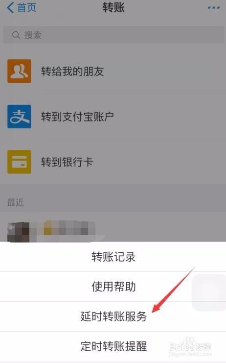 点击了三点之后会弹出几个选项,如下图所示,我们选择延时转账办事。