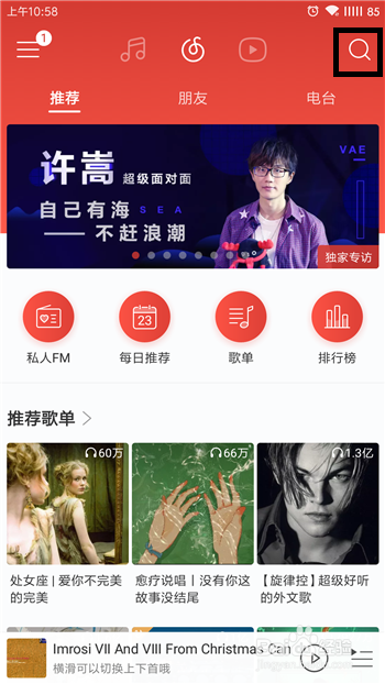 打开手机中的网易云音乐,进入到首页后点击右上角的【搜刮选项】。
