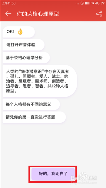 点击后就进入到荣格心理测试了,在测试之前会提醒我们是否领会【心理学家荣格】,好奇的小伙伴可以点击【领会一下】。