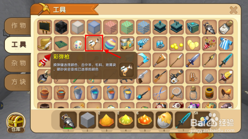 按B键打开背包然后拿取彩蛋qiang,此道具保存模式是无法建造的。