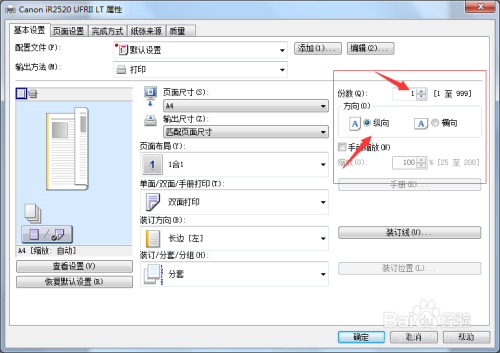 然后,我们设置份数和偏向,按照本身的现实打印需要,设置份数,横标的目的货纵标的目的打印,如下图所示。
