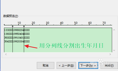 在第二步,我们需要手动调整排列线,将身世年代日这些数字和其他的分隔,如下图一所示;然后将双方无用的数字勾选为“不导入此列”,接着选中年代日这一列,将其设置为“日期”,见图三...