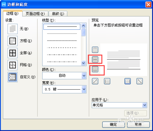 在弹出的“边框和底纹”窗口,选择“边框”栏,在右侧预览处操作只保留底部边框和中心横线边框。(PS.名字我也不知道怎么叫,大要起的,大师不要在意哈,本家儿要看图)
