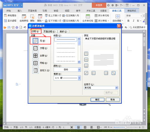 在弹出的“边框和底纹”窗口,选择“边框”栏,选择设置中的“无”边框,然后确定