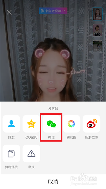 点击后会在界面的下方呈现几个分享的选项,可以点击QQ或者微信老友,这里以微信老友为例,点击【微信】。