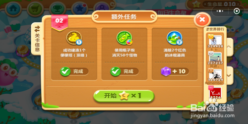 关头需要领会的是这一关获得金萝卜的使命,使命是建造1个顶级便便塔,用瓶子炮灭失落50个怪物,而且清理2个失落红色冰糕道具,这人使命均没有时候限制。