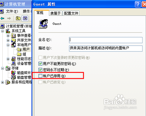 双击打开“Guest账户”,然后在打开的宾客账户属性中,我们将“账户已停用”这个选项的选勾去失落,然后点击“确定”。