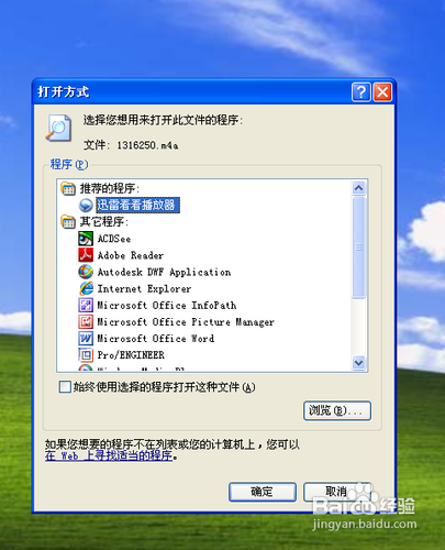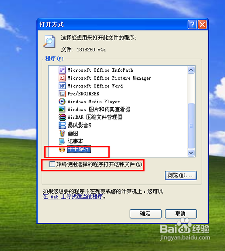 然后我们就能在法式列内外面找到我们的千千静听软件啦,从图片中大师可以清楚的看到,好了,这里我们勾选“始终利用选择的法式打开这种文件”。
