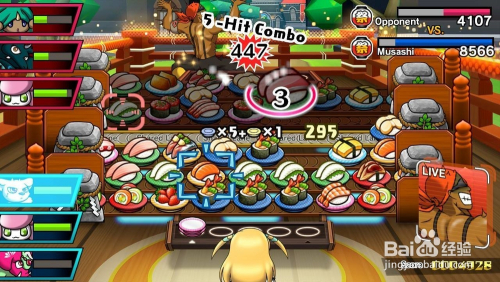 我早些时辰描述了角逐的要点,但有点牵扯进去。在每一场战斗中,屏幕分当作两半,每一个玩家的程度面上有三条程度的寿司。中心有第四个车道,两个球员都可以利用。