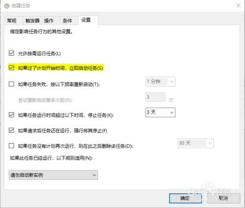最后我们要在“设置”选项卡,勾选“若是过了打算起头时候,当即启动使命”,然后点击“确定”。如许禁用网卡的使命我们就做好了。