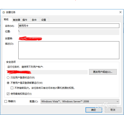 建立网卡禁用使命:点击“操作”-“建立使命”,输入使命名称,选择“不管用户是否登岸都要运行(W)”,勾选“利用最高权限运行”
