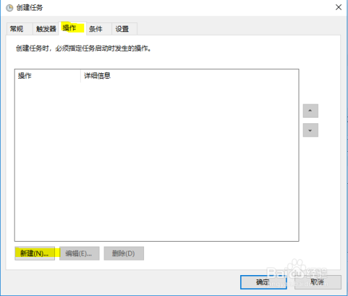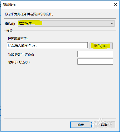 设置执行的操作:选择“操作”选项卡,点击“新建”,在弹出窗口下拉列表选择“启动法式”,浏览选择我们之前做好的.bat文件,然后点击“确定”。