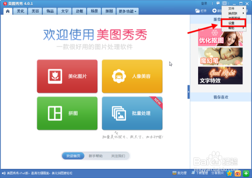 点击美图秀秀本家儿页面右上角的倒三角形,然后锁定“设置”选项,点击进入。