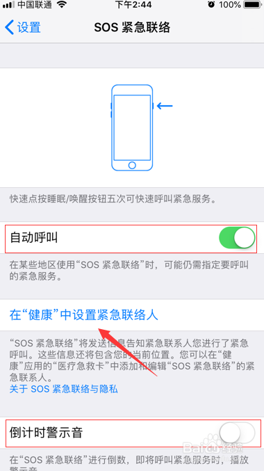 打开主动呼叫后,我们最好把倒计时警示音封闭,如许省得手机发作声音引起犯罪分子注重。我们点击在健康中设置告急联络人