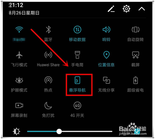 手机解屏后,在手机屏幕顶端,用手指从上标的目的下滑,打开下拉菜单,鄙人拉菜单中,点亮“悬浮导航”图标,即可启用悬浮按钮。